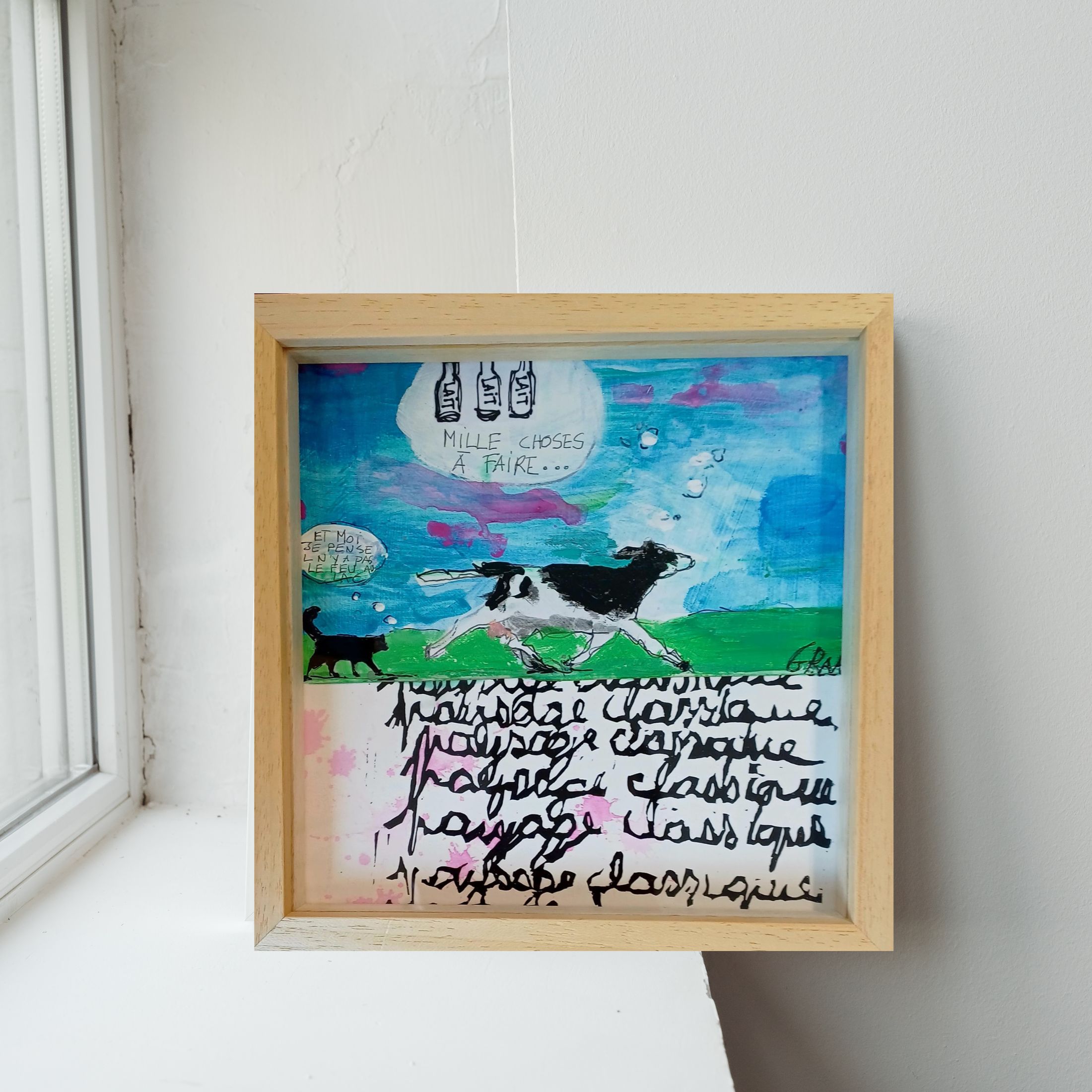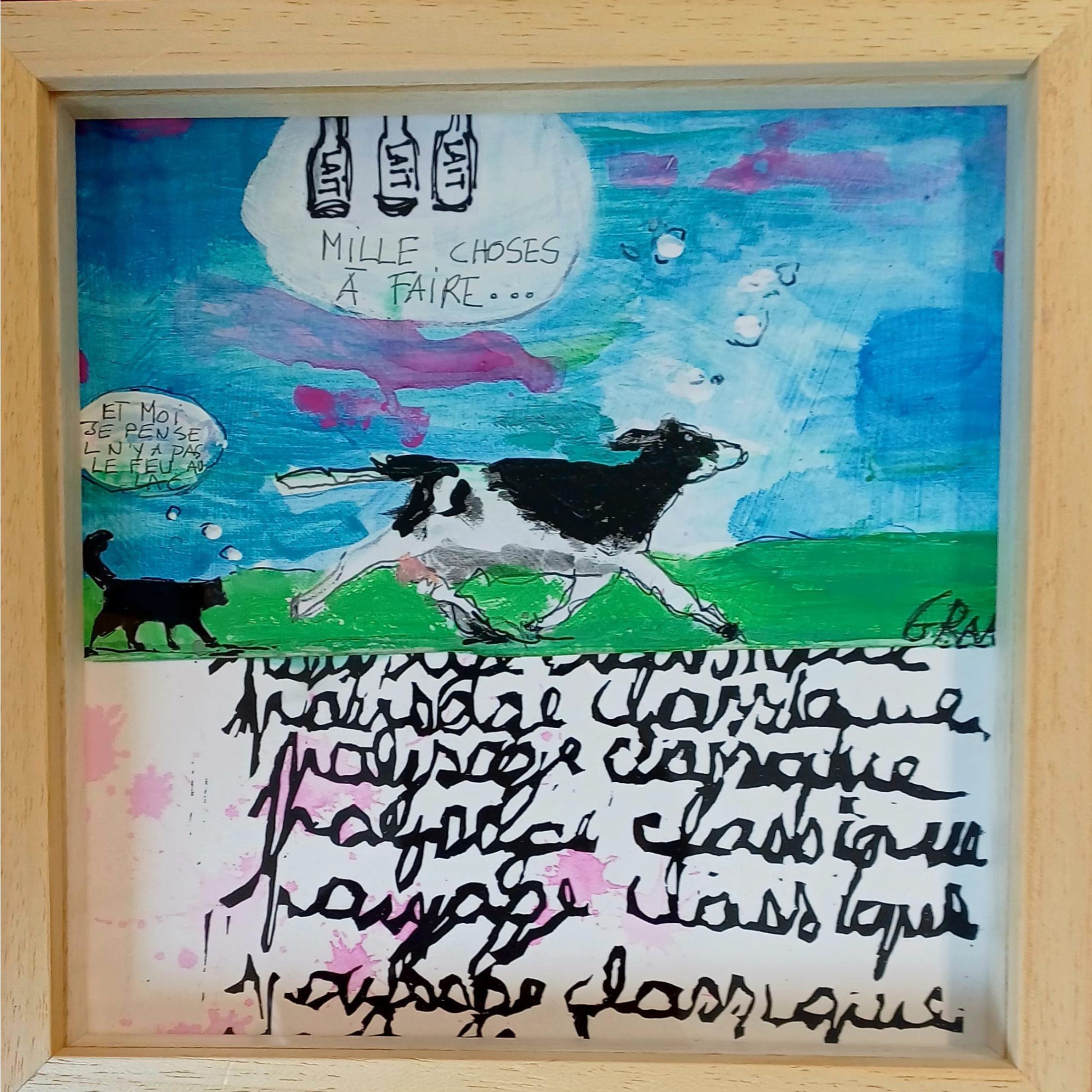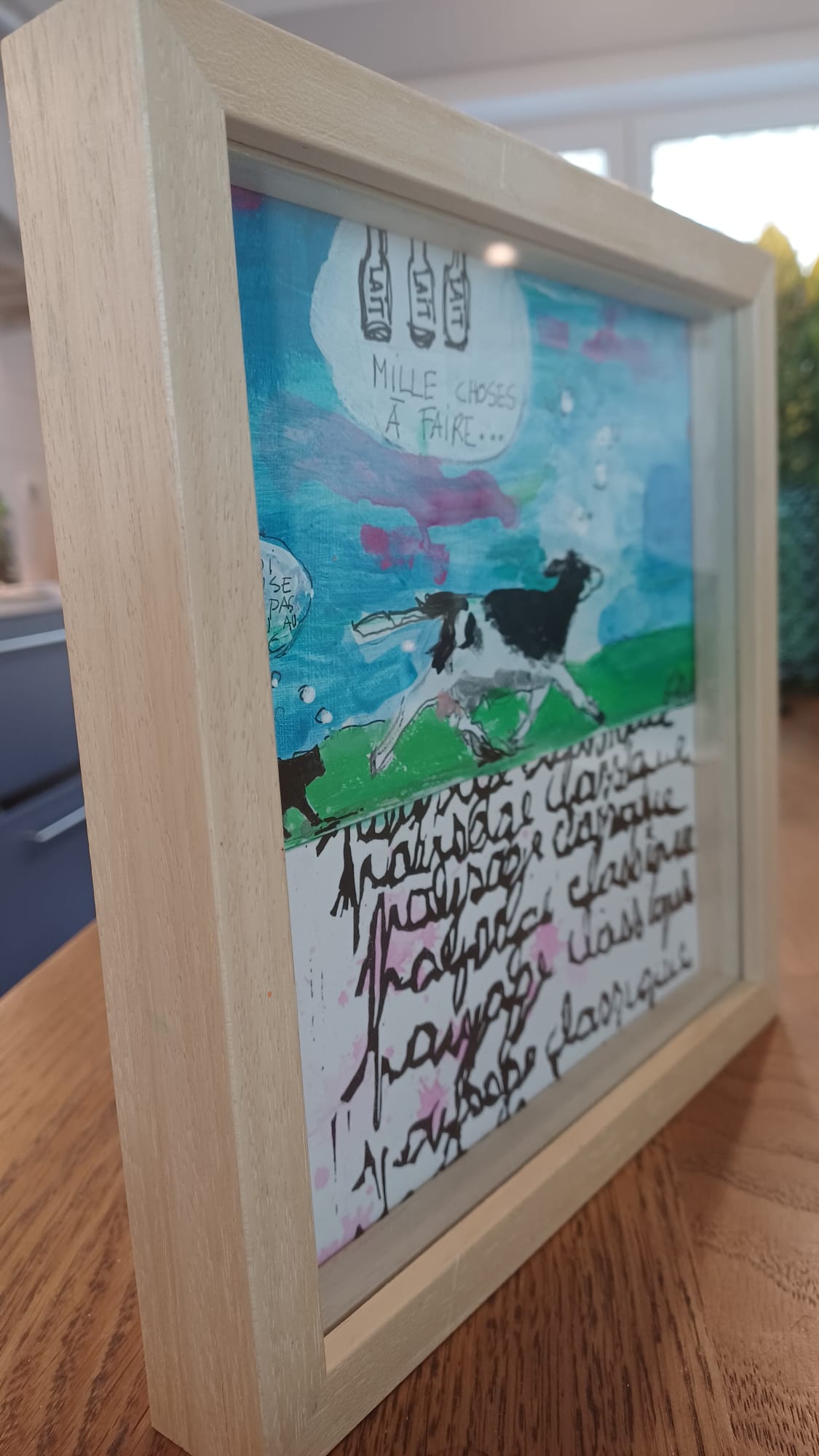 Le tableau mêle peinture acrylique, gravure et écriture gestuelle, comme des fragments de pensée qui se superposent. Le texte, volontairement libre et presque illisible par endroits, évoque le flux intérieur, les listes mentales, l’encombrement doux du quotidien.