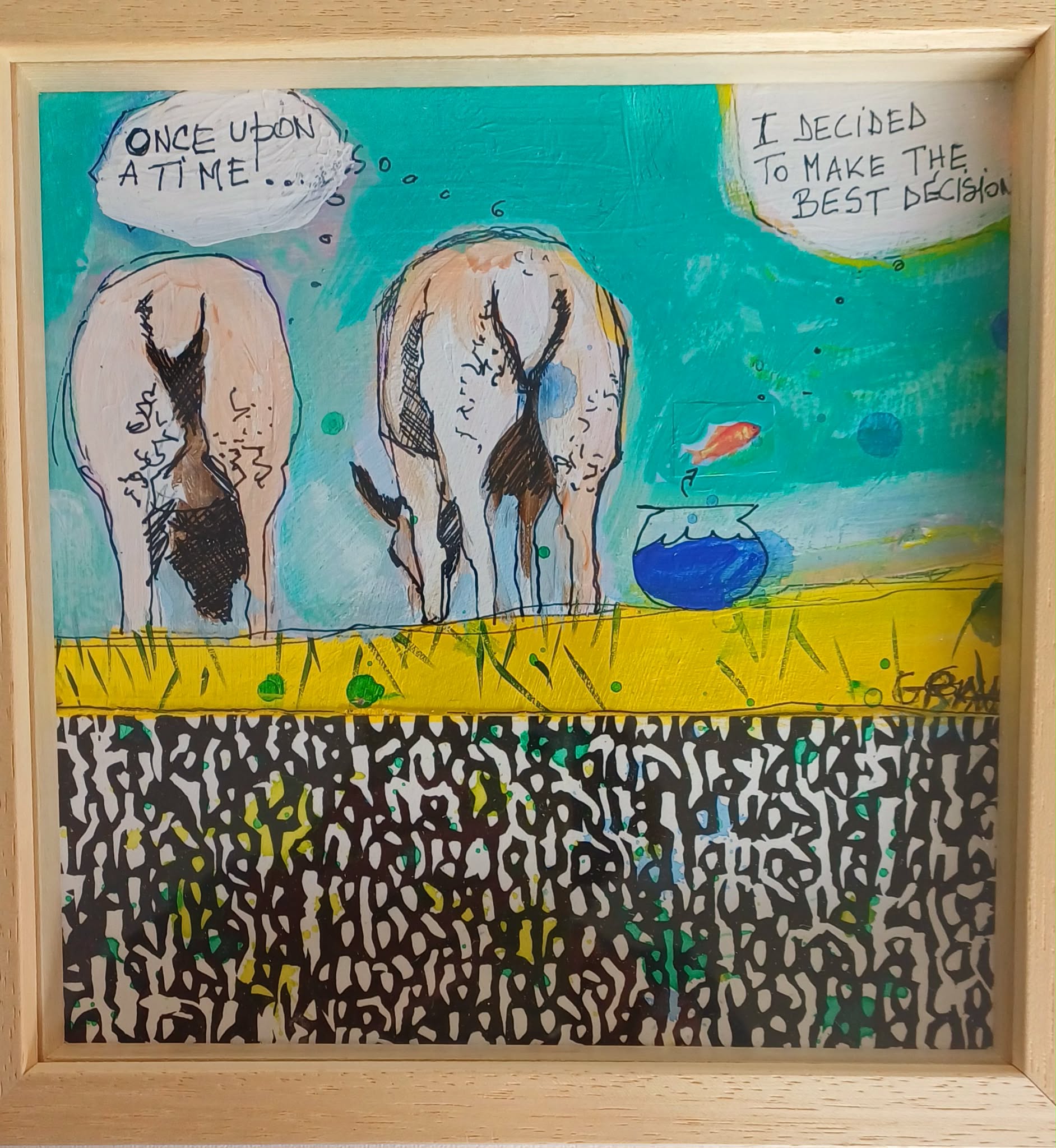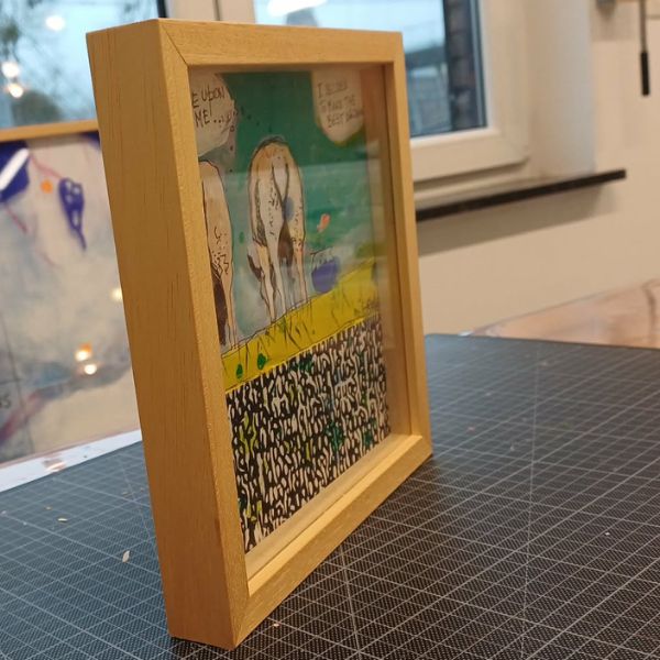 Le mélange de peinture acrylique et de gravure donne au tableau sa texture singulière : couches, traces, écriture visuelle et matières dialoguent, créant une œuvre à la fois spontanée et structurée.